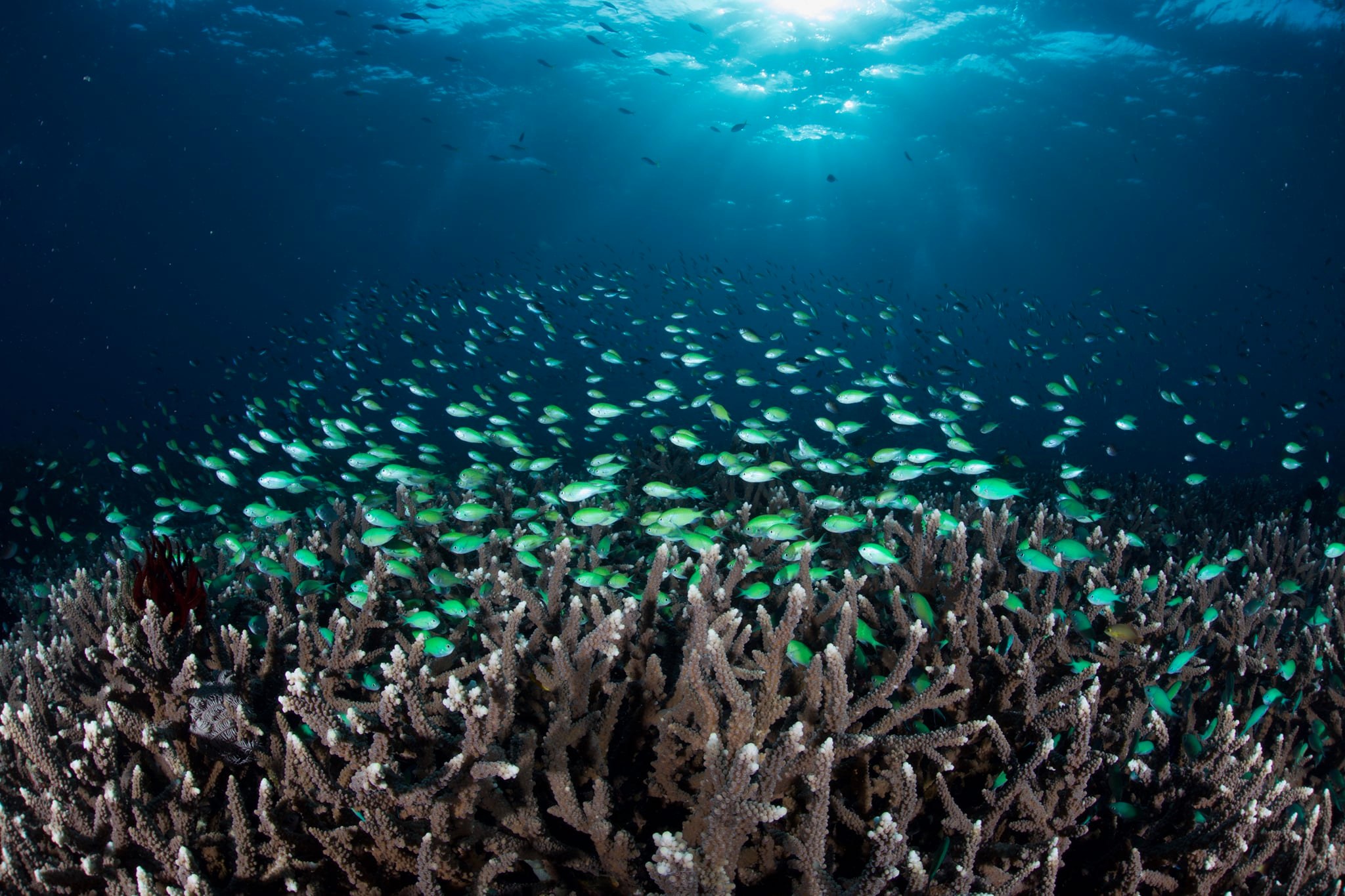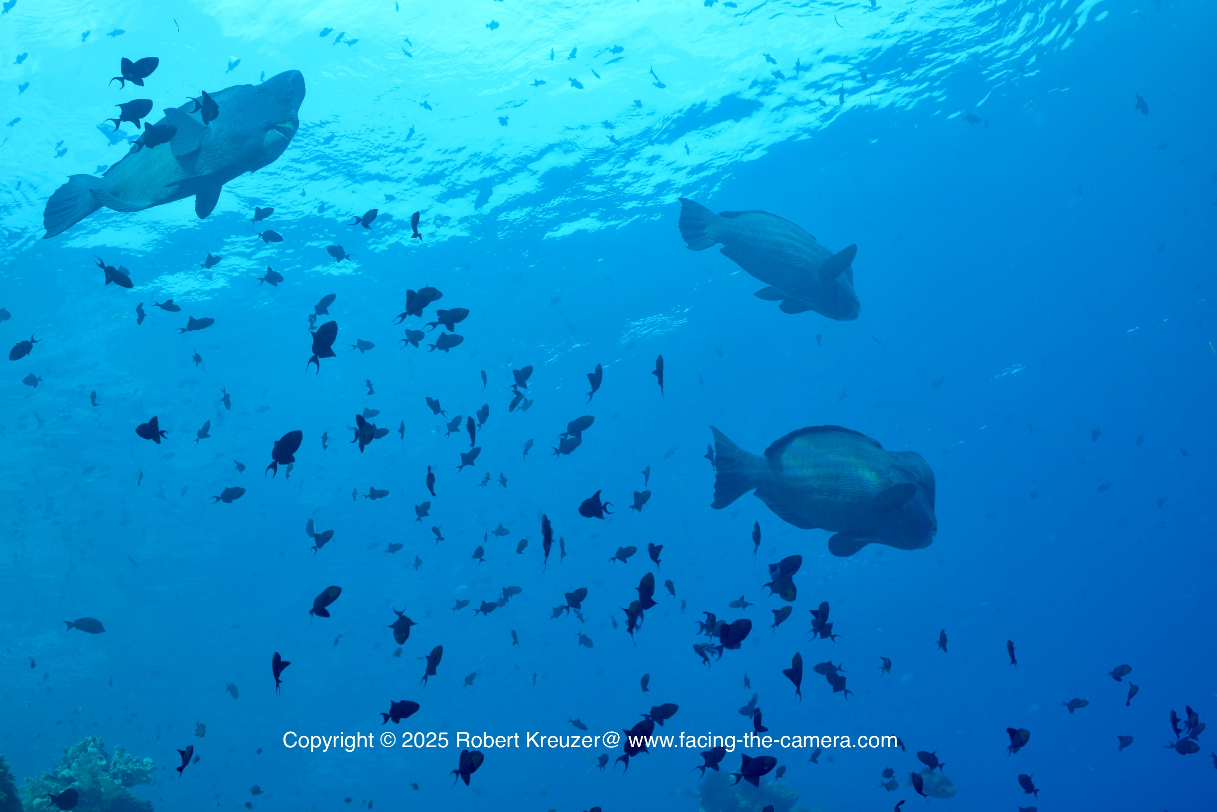 A bit further along, a group of humphead parrotfish (Bolbometopon muricatum) appeared in the distance. Massive and unmistakable silhouettes cruising calmly.