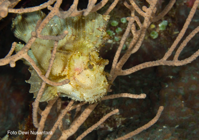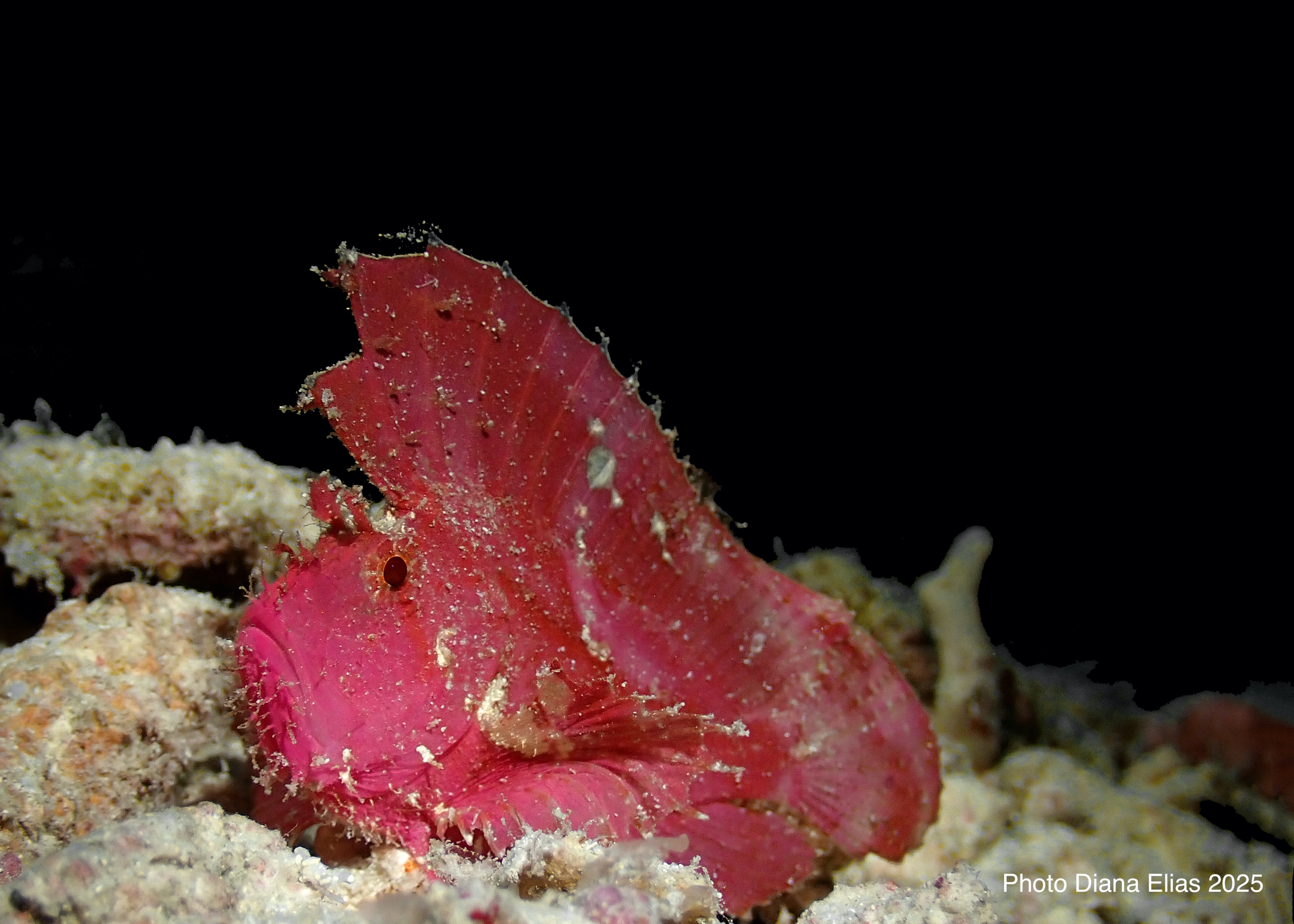 A yellow-edged moray (Gymnothorax flavimarginatus) peeked out from a crevice, while on a coral branch we spotted a leaf scorpionfish (Taenianotus triacanthus), still and perfectly camouflaged.
