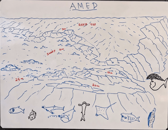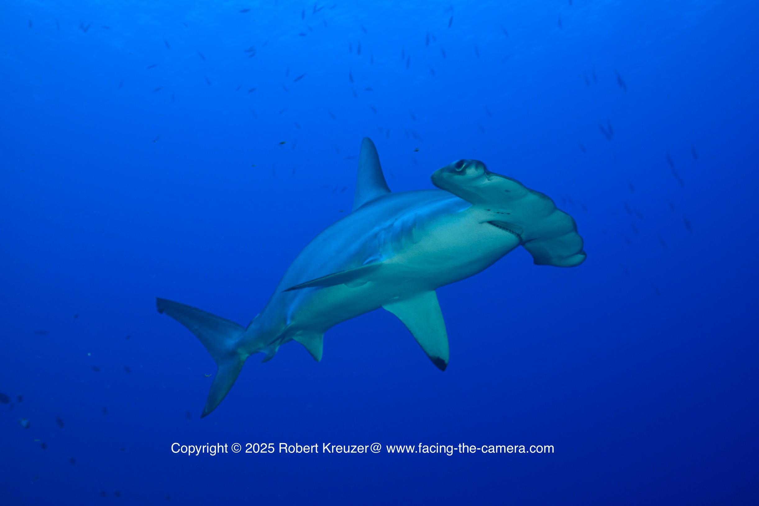 The first dive of the morning was one of those you don’t easily forget: out in the open blue, with a light current still running, he appeared — a hammerhead shark (Sphyrna lewini), solitary, elegant, perfect. A brief but powerful encounter, the kind that makes every pre-dawn wake-up feel completely worth it.